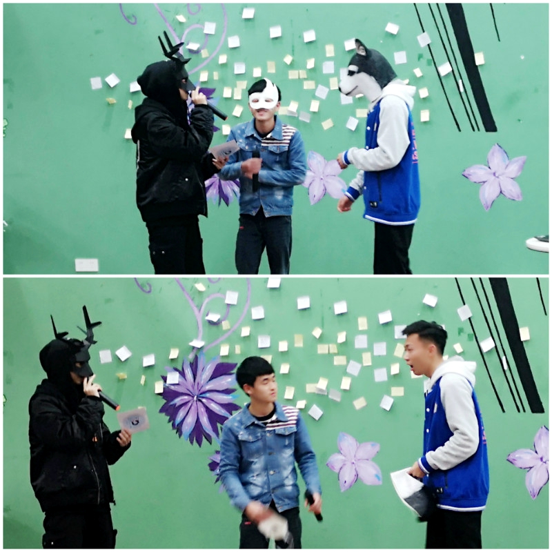 接下来是“相知”环节,主持人随机抽取号码,被pick的8号伙伴上台啦,简短的采访后,我们知道他单身哟,只可惜在舞台后方的墙上抽取写有个人兴趣爱好的便签时抽到了男生,不过最后这两名同学都愿意为彼此摘下自己的面具,相互认识,最后的拥抱也是满满爱意。