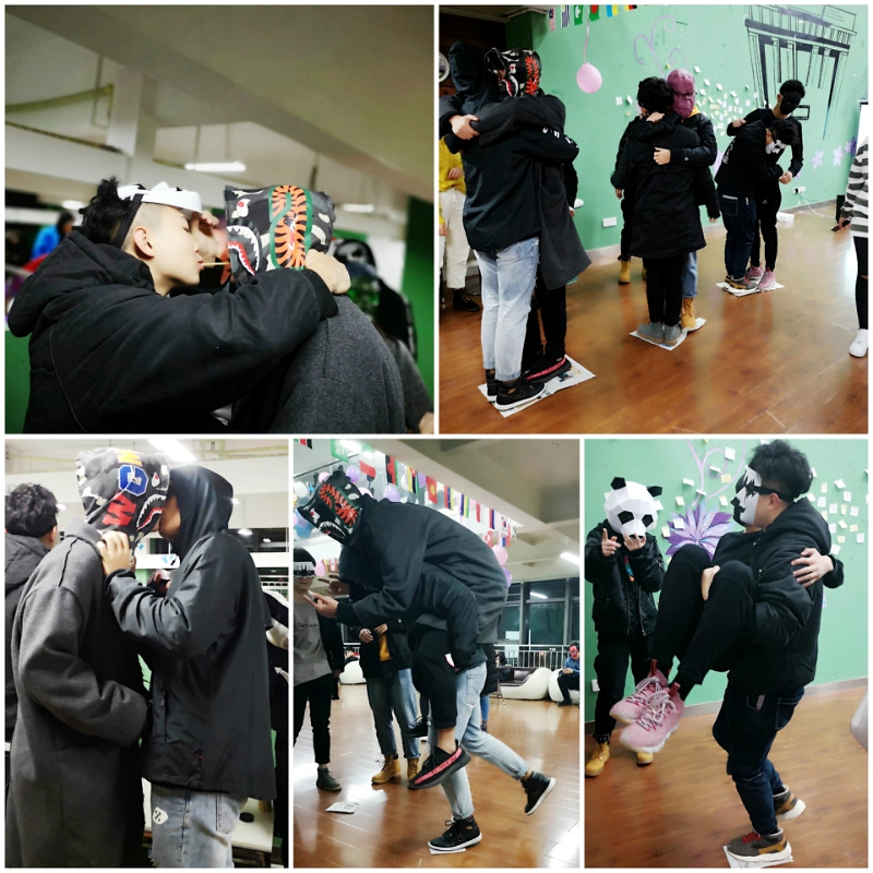 活动主持人“黑鹿”宣布开始后,首先进入的就是“相遇”环节——也就是大家自行组队两两参加游戏,活动有5个游戏,包括“土味情话”、“送命”题、“直男测试”、“靠近的你”、“爱的距离”,每个活动需要大家全程戴着面具,其中有一条小规则,如果是异性组队还有额外加分。