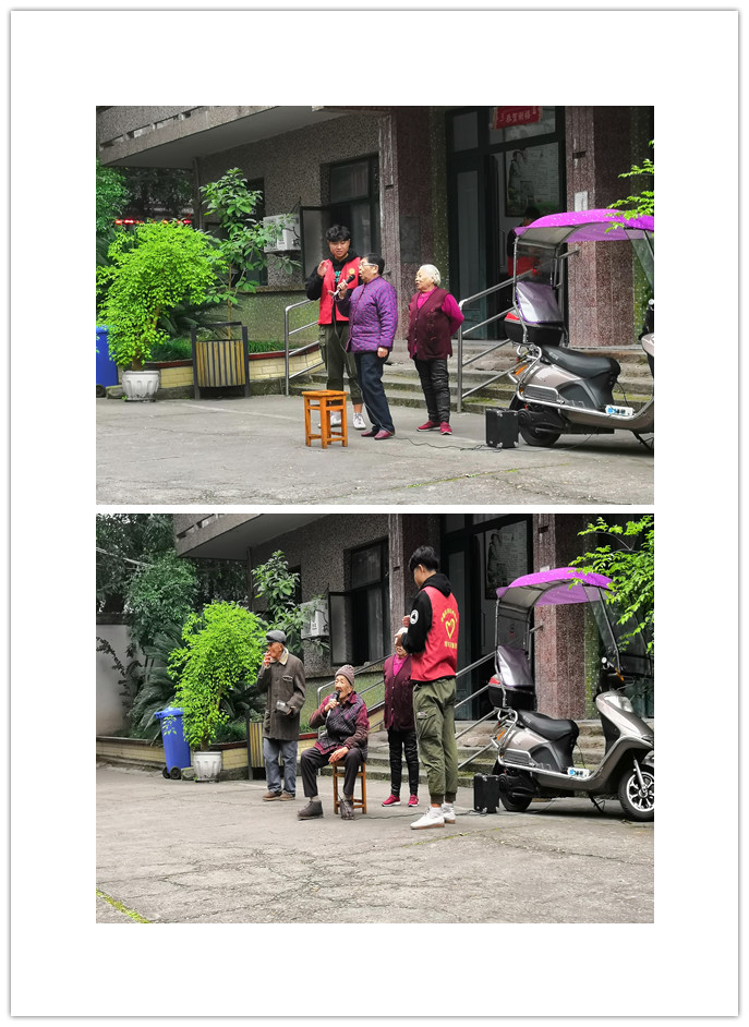 接下来志愿者为老人们表演了几个小节目,有一位奶奶为表达自己的谢意,迈着蹒跚的步伐,走到话筒前,特意也为志愿者献上了一首歌曲。有了她的带头,接着又有两个奶奶前来献唱,为志愿者们演唱了她们那个年代的歌曲。看到老人们灿烂的笑容,听到老人们爽朗的笑声,志愿者们充分体会到了本次志愿服务活动的意义所在。