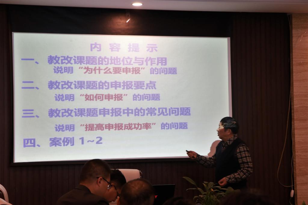 继而汪教授详细的从课题的来源、修改课题的作用、修改课题项目分类等方面为在座教师详细阐明了立足我校申报教改课题的优势。对关于申报书的填写要求也做了详细的讲解,以避免在申报过程中出现不必要的错误。