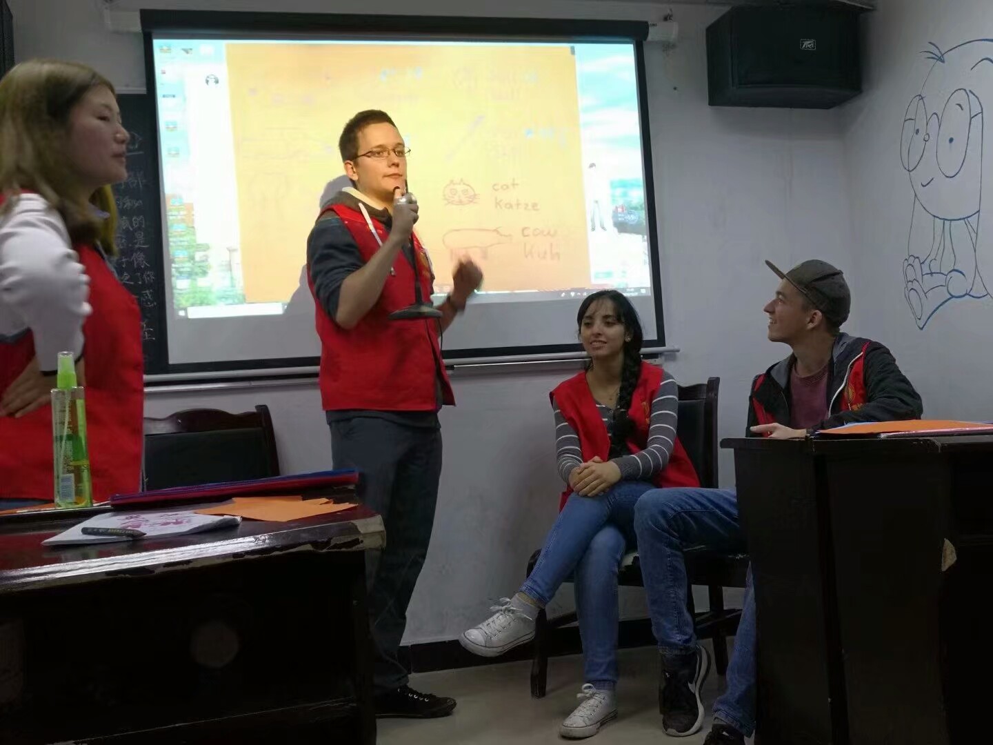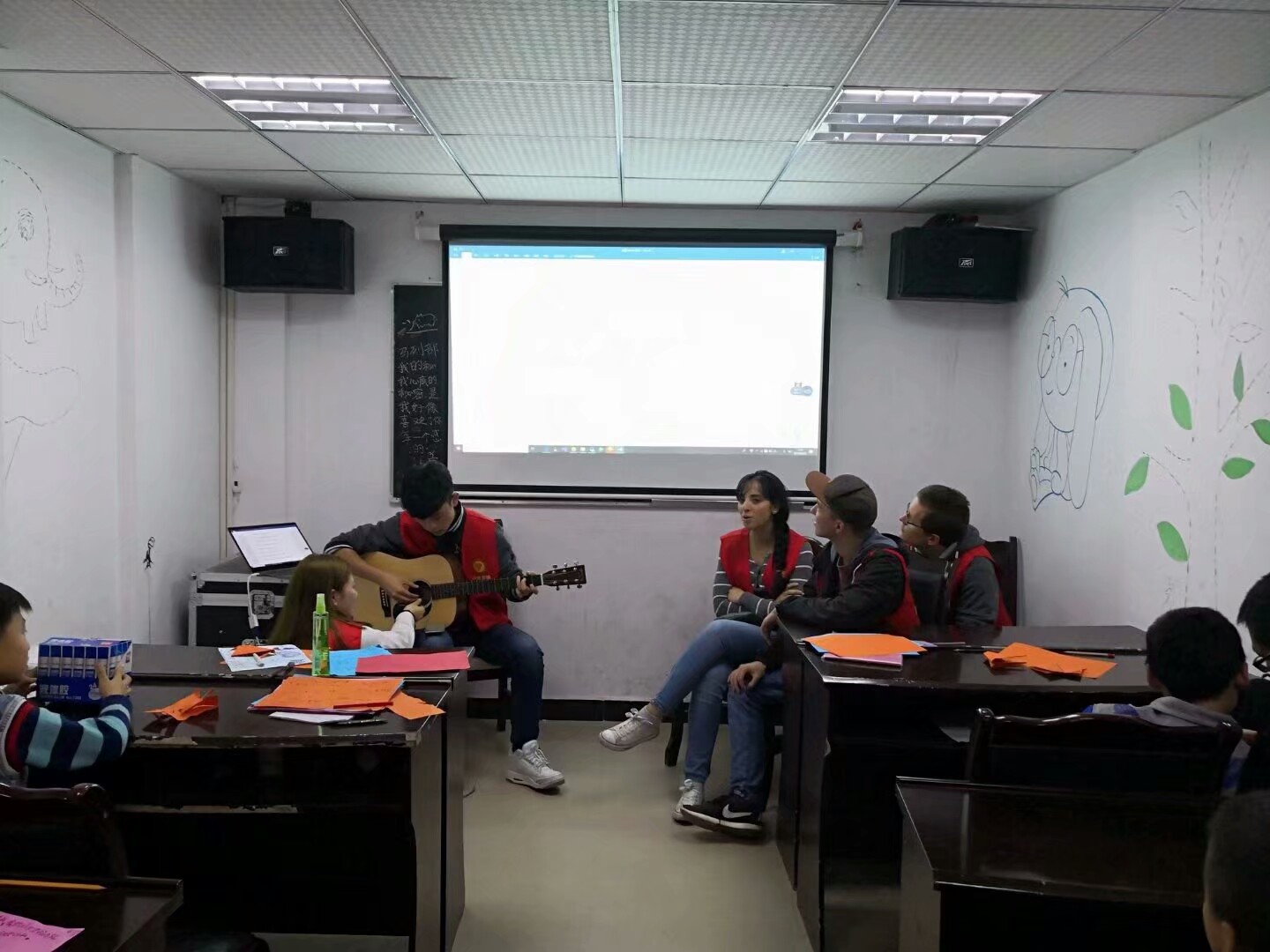 一开始由于语言上交流不方便,留学生和孩子们只能通过国际处学生翻译进行交流,在志愿者的帮助下孩子们慢慢和三位留学生熟悉了起来。留学生也开始在志愿者的帮助下通过画画的形式教孩子们简单实用的英语单词和口语,接下来为大家演唱了外语歌曲,活动最后留学生志愿者和小朋友们一起做起了小游戏增加孩子们学习外语的热情。