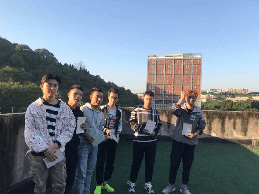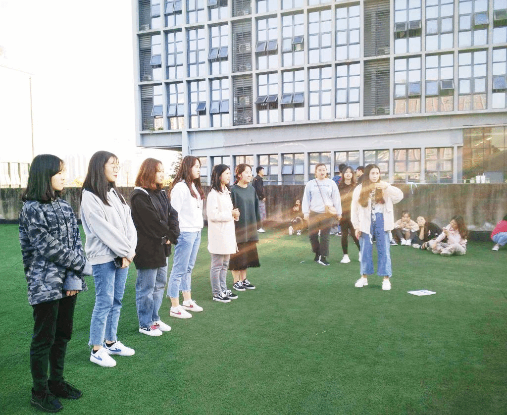 下午五、六节课下课后,同学们陆续在下里巴人的天台上汇合,然后由主持人程雪磊宣布游戏内容和注意规则后团建活动开始。第一个游戏“传递字母”两个班分别出3组进行,每组5个人,在游戏中只能用身体来表达字母传与下一个同学,其中用时最少的一组获胜。