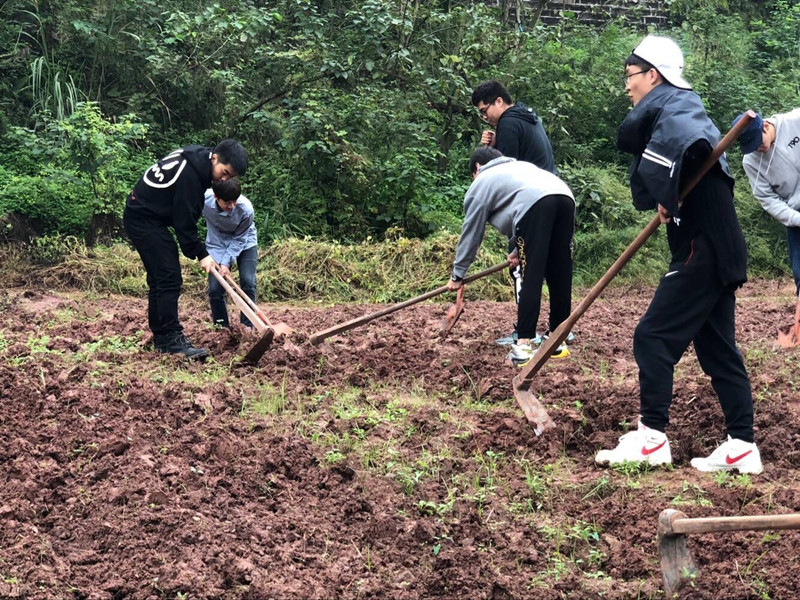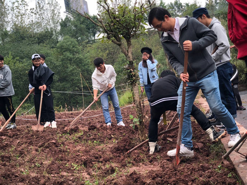 有劳动工具的同学极其认真的翻地,而那些没有拿到劳动工具的同学徒手拔草,任凭泥土弄脏了双手,也没有一丝怨言。这时,辅导员蒋志强老师也加入到农耕的队伍里。当同学们看到老师与他们一起在劳作,顿时干劲十足,不由得加快了手上的速度。蒋老师边带领我们农耕边给我们讲他以前在农村的故事,让我们了解了劳动的辛苦和父母的不容易。
