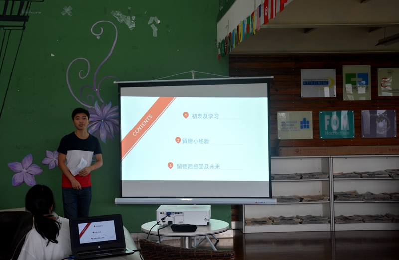 刚去德国难免会有些不适应,由于口语比较差导致生活中出现了许多没必要麻烦,比如吃饭去点餐点了一堆汤上来,上课找错了教室,甚至问路的时候都没有办法和当地人交流,一系列的琐碎问题都耗费了自己大量的精力,所以他希望同学们在国内的时候把德语基础打牢,珍惜每一个清晨因为那样可以大声地标准地朗读句子,帮助自己尽快熟悉语感。同时他还提到多学一些生活技能如:缝衣服、炒菜、打扫家等,这样可以让自己的生活变得多姿多彩,而且可以很快学会独立生活。最后他又为我们讲述了他的留德感受及他自己憧憬的未来,如若学有所成,可以为国家和社会贡献自己的力量,同时也能够实现自己的人生价值!