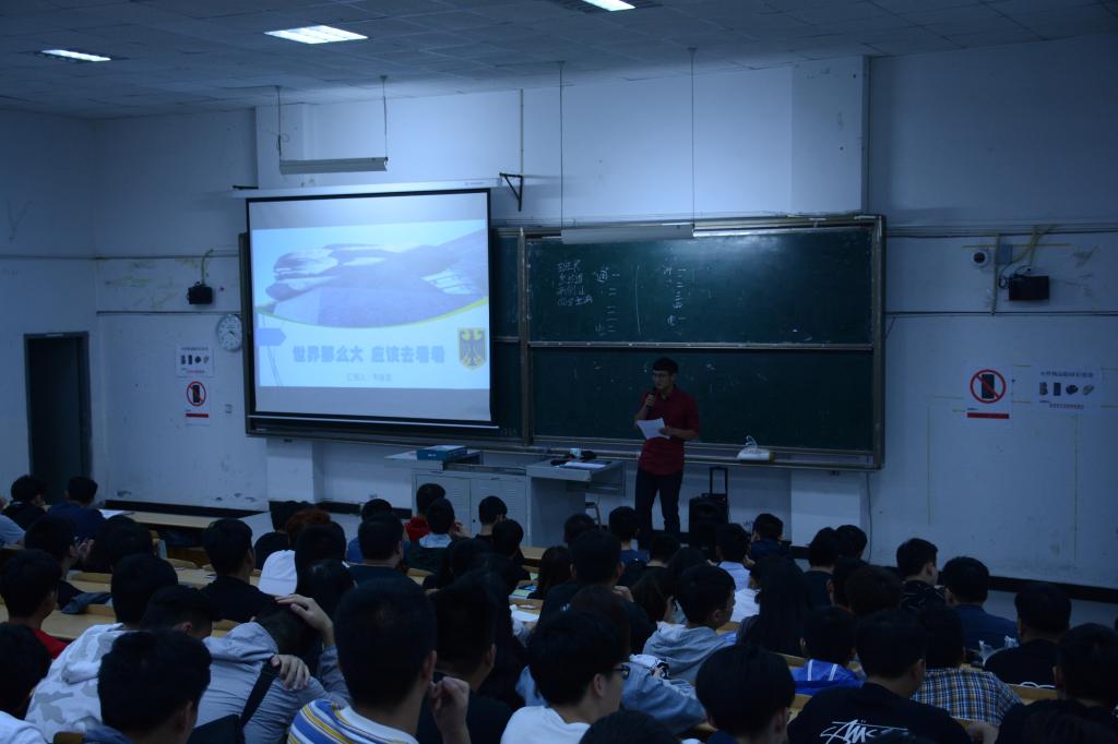 首先是关于德国的交通。当他下了飞机之后,第一眼看见的是一望无际的田野,“这是我对德国的第一印象,”他这样说道,修建在田野里的机场别有一番韵味。“你们猜猜,我们的老师在高速路上开车,最快开到了什么速度?”这就是他对德国交通的另一个印象——不限速的高速路,在国内的高速,小轿车限速120码,可是到了德国,200多码的速度让他心跳不已。