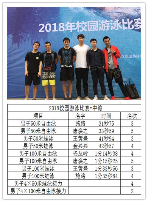 四月二十一号,早上九点,微风轻抚,天气凉爽,我们迎来了2018年校园游泳比赛。我院代表队由金兴兴领队,带着我们中德的运动健儿们与校另外八支队伍在c区的泳池中一较高下。男子队队员是王黄熹,唐焕之,杨丛岭,金兴兴,施路,祝欢,女子队队员为周姝婕,陈虹莹。
