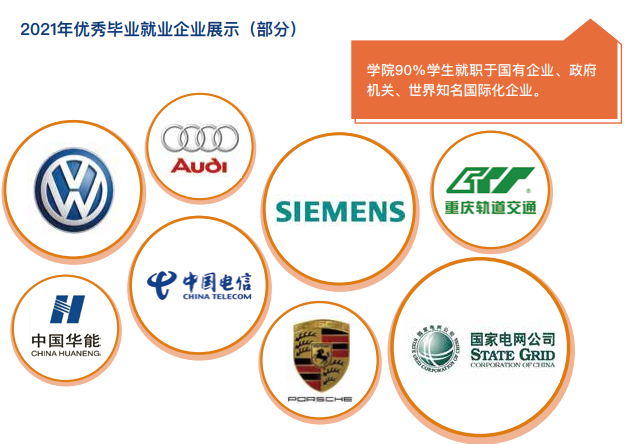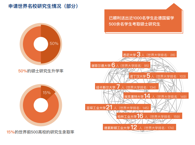 学院已顺利送近千名学生至德国高校就读,目前硕士研究生升学率达50%,世界前500高校的研究生录取率达15%,中外合作办学项目毕业生,拥有专业、语言及跨文化优势,90%学生就职于世界知名国际化企业。