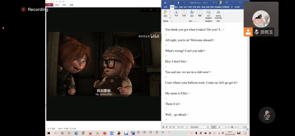 接着进入到了单人配音阶段,在线的每位同学都有一次配音机会,大家都做足了准备,跃跃欲试。同学们分别为飞屋环游记、疯狂动物城里面的截取片段配音,这不仅是一场充满欢乐的配音之旅,还是一次学习英语口语的绝佳机会。
