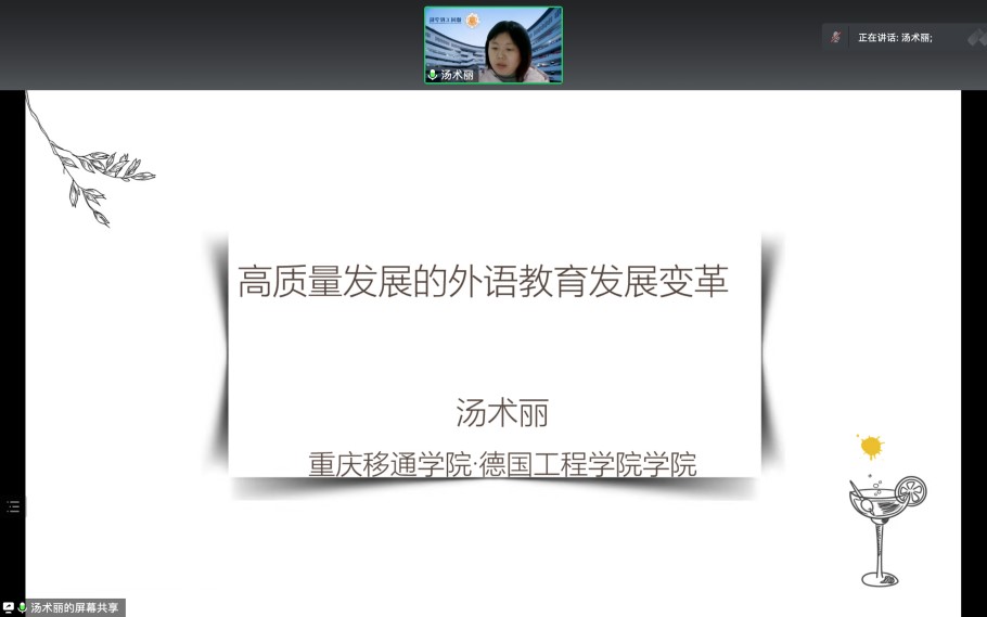 汤术丽老师从北京外国语大学张剑教授、上海外国语大学陈壮鹰教授等在以“高质量发展的外语教育发展变革”为题所做的主旨报告出发,分享了当下外语发展的困境及各高校的解决措施,并讲述了自己从中所获得的关于学院德语发展及教师个人发展的启示。李晓锋老师在学习复旦大学《外语学科卓越拔尖人才培养》之后,介绍了新时代外语人才培养模式以及外语学科课程建设,并展示了复旦大学和南京大学的的具体案例。分享结束后李老师就“如何讲好中国故事”阐述了自身观点。