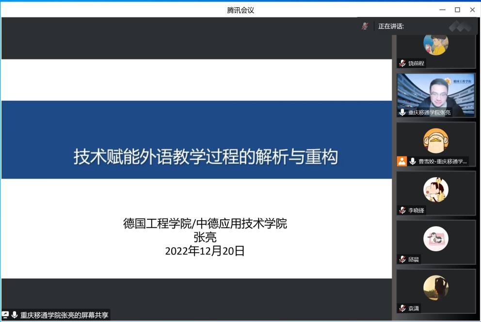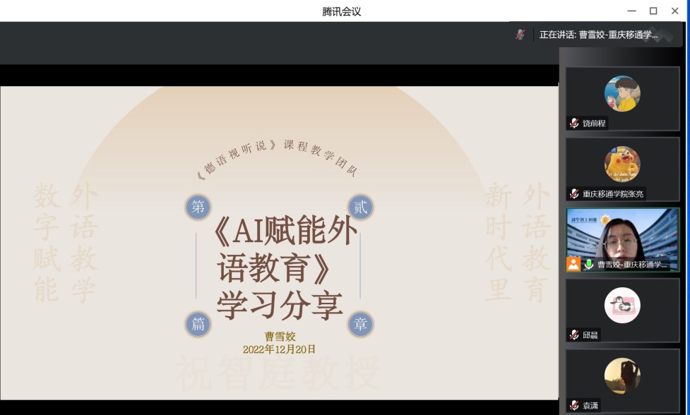 为推动团队建设、提升教师能力素养,《德语视听说》课程教学团队于12月20日通过腾讯会议的方式召开教学分享交流会议。会议主题为分享研讨习得的新知识、新内容、新技能,为团队建设添砖加瓦。会议由团队带头人曹雪姣老师主持,团队成员全员参与并进行发言。