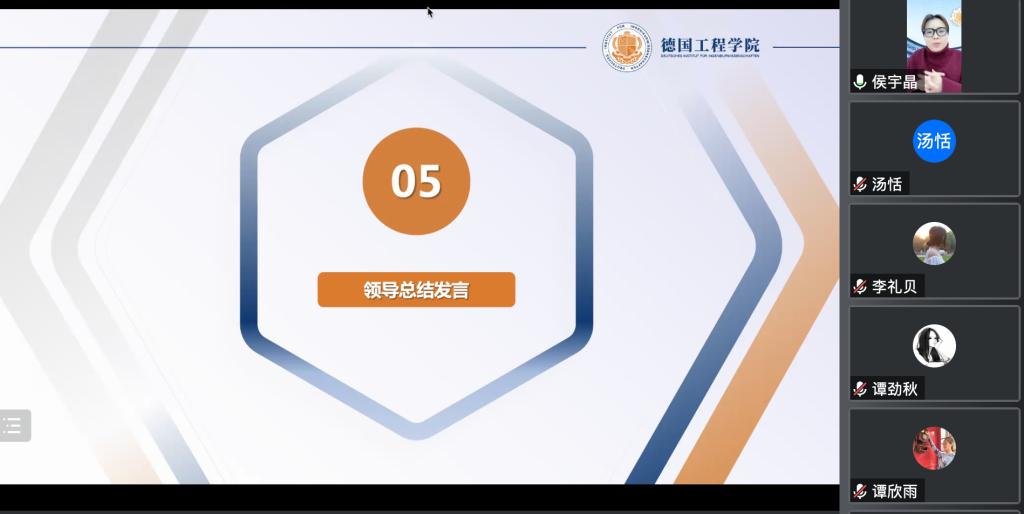 为深入贯彻“人才强校”战略,促进师资队伍建设,总结经验,为新学期“老带新”工作做好充分准备,12月14日,德国工程学院/中德应用技术学院举行了2022-2023学年第一学期“老带新”工作线上总结会,参会的有副院长侯宇晶、指导老师向觅、伍丽君、谭劲秋、张亮、陈西楠、刘佳、李欣老师以及2022年新进教师7名。