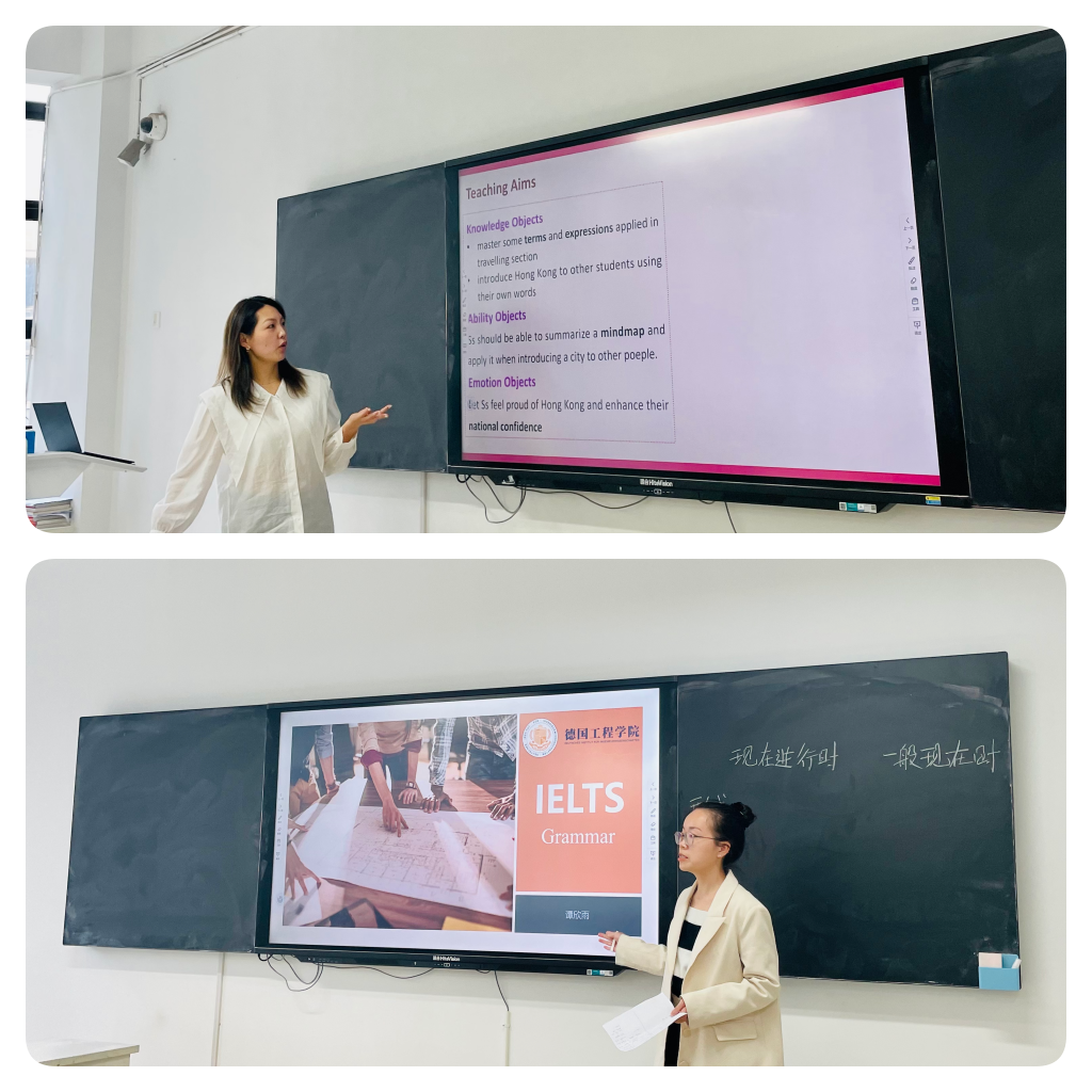 首先郝思嘉老师为我们带来的是描述香港旅游的一篇阅读文章,通过阅读前、中、后的教学设计,在提高同学们阅读技巧的同时,融入词汇拓展、听口练习;谭欣雨老师通过一般现在时和现在进行时语法的讲解,让同学们更清晰全面地了解到该语法的不同应用场景;汤恬老师通过丰富的教学道具和精美的ppt让同学们掌握了动词在疑问句中的位置;李礼贝老师用一系列复合词向同学们展示了如何高效地扩充词汇网、记忆长单词、猜测词义等。