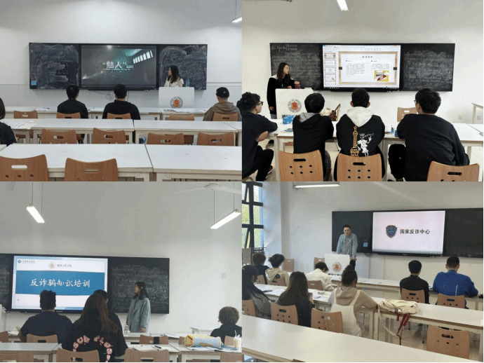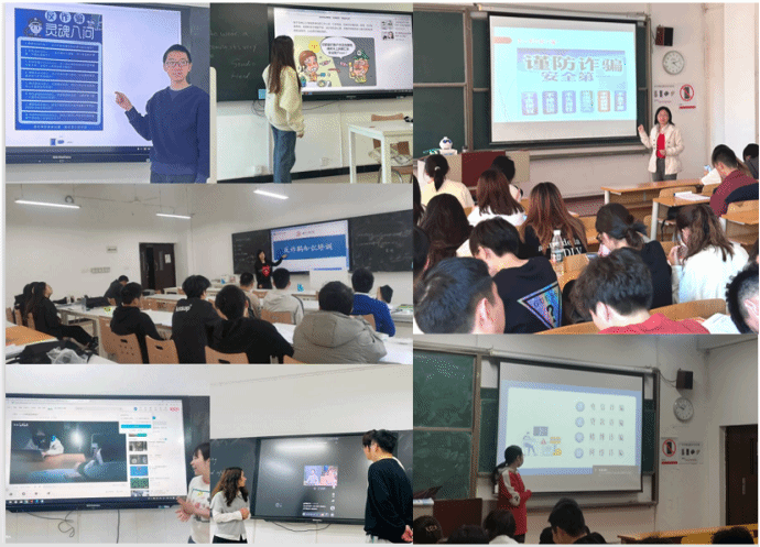 蹇红、邱晨、袁潇和张亮老师导师分别在课堂上对同学们进行了反诈防骗宣传。蹇红老师带领同学们观看反诈视频,以案例说法,并逐一讲解疑似被电信诈骗人员的突出表现,及相应的应对措施。邱晨老师通过从仿冒身份类、购物类、虚假活动类、利益诱惑类、生活消费类等方面详细讲解不法分子常用的电信诈骗手段,提醒同学们如遇可疑情况,要多和家人、朋友沟通商议,以免遭到不法侵害。袁潇老师向同学们讲解了反诈宣传手册,告诫大家在日常生活中提高警惕,不贪图小便宜、不透露个人信息、不轻易转账汇款,如遇到可疑情况及时报警求助。张亮老师提醒大家下载国家反诈中心APP,阐述了电信诈骗的类型,普及了相关法律知识,并结合电信诈骗真实案例提醒大家提高警惕。