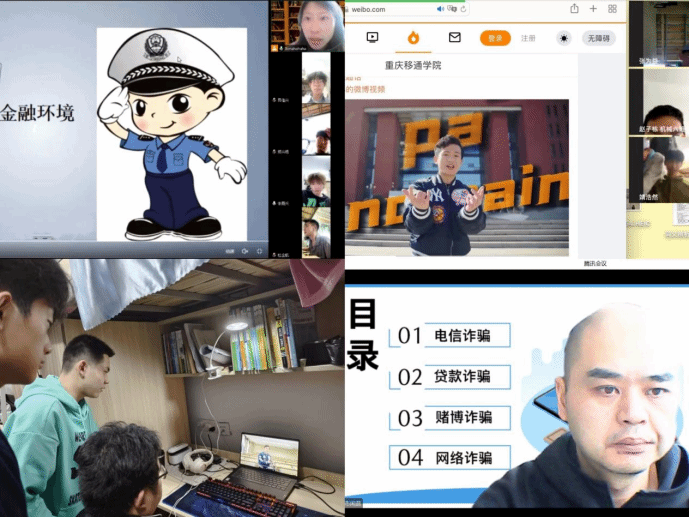 谢熙、荣婧、李梦婷、钱柯竹和荣婧几位导师在线上线上对学生进行了反诈宣传。谢熙老师从电信诈骗、贷款诈骗、赌博诈骗和网络诈骗几个方面,通过案例分析进行了详细讲解,提醒大家要不断更新自己的反诈知识,从源头上防止上当受骗。钱柯竹和李梦婷导师则采用腾讯会议对形式,提醒学生如遇来历不明的电话、短信、微信或不明链接,要仔细甄别,不向他人透露自己及家人的身份和银行卡等信息,用通俗易懂对方式进行反诈讲解,一旦遇到或发现电信网络诈骗行为时要及时报警,防止不必要的财产损失。荣婧老师在清明节组织了同学们在寝室集体观看反诈宣传视频,让大家在假期尤其要提高警惕,注意反诈防骗。