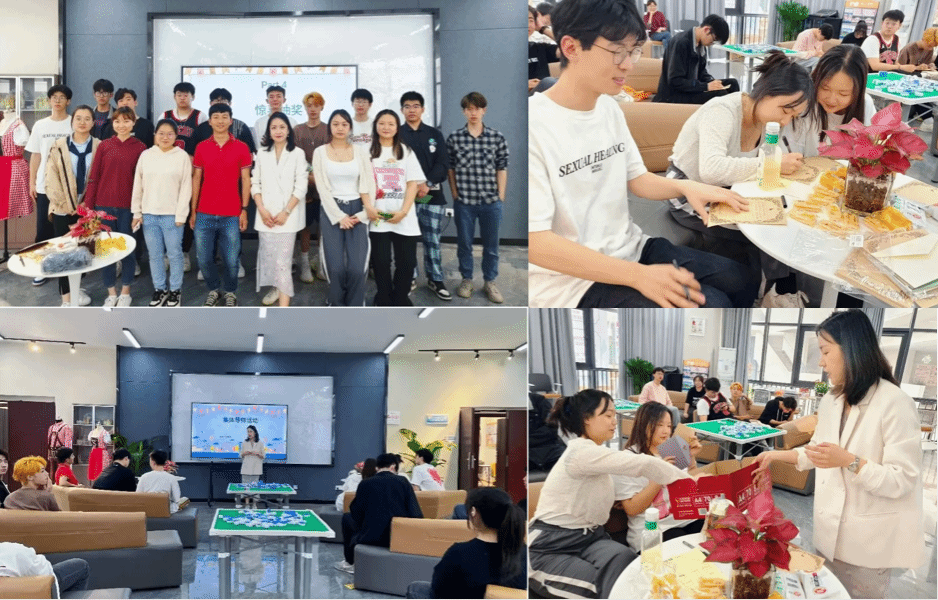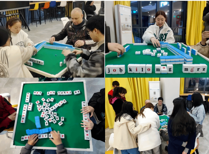 第32期德语角活动将南湖书院的英语麻将改成了德语版。每张牌都是字母,多张牌组一个单词,就成了一体牌。玩这种牌不是赌博,而是寓教于乐。单词量越大的人,越能和牌。本期活动不仅帮助学生检验了德语词汇习得成果,还实现了跨文化交流,让外教了解和体验了中国传统麻将文化,可谓中西合璧,脑洞大开,寓教于乐。