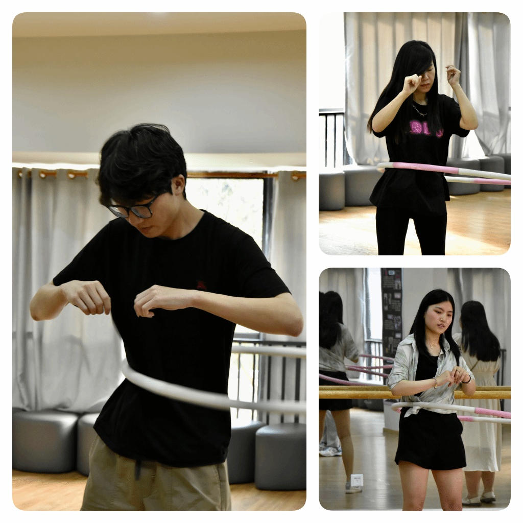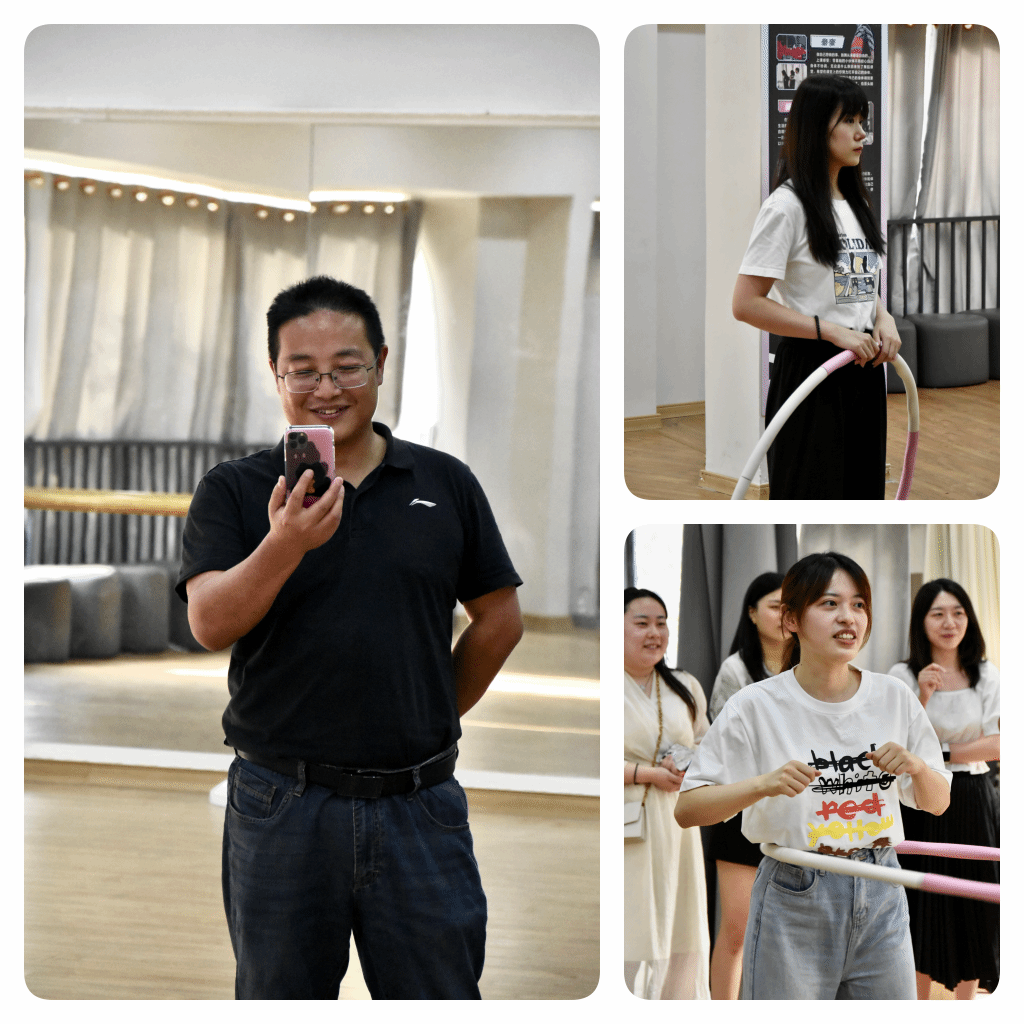 正式比赛前,尹助理带领大家进行了热身练习,调整状态。虽然有些同学是第一次转呼啦圈,但是依旧不影响大家的热情和积极性,都在积极备战。在完成了15分钟的充分热身后,活动正式开始。郝老师宣布比赛规则:导师带领自己的学生为一组依次转动呼啦圈,如果呼啦圈掉落则换下一位组员接着转,计时五分钟内团队转动呼啦圈总个数多者胜利。