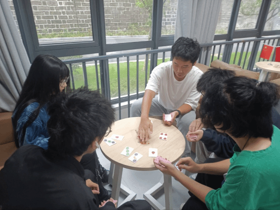 三位导师在这次活动中采用了寓教于乐的交流方式——带领学生们使用德语玩桌游。本次导师们在商讨后精心挑选了德语版“狼人杀”和“德国心脏病”等两款学生们非常感兴趣的桌游,旨在于游戏过程中融入德语教学,激发学生们的德语学习兴趣。在“狼人杀”环节中,吕巍老师和谢熙老师教授了游戏中各职业的德语名称:如狼人——der Werwolf、女巫——die Hexe、预言家——der Weissager等,以及游戏中各属于的德语表达方式:如“天黑请闭眼”——“Es ist dunkel, schlafen Sie bitte.”、“天亮了”—— “Die Sonne geht auf.”、“狼人请杀人”——“Die Werwölfe, töten Sie bitte” 等。学生们在紧张刺激的烧脑游戏中潜移默化地积累了德语知识。