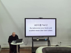 活动伊始,杨洪老师和计媛老师配合Julio首先向同学们介绍了A2口语第二部分的基本情况,让同学们了解这部分的口语练习需要如何进行,并且为同学们准备了Redemittel(常用句型)供大家参考,让同学们根据不同的主题进行对话练习。