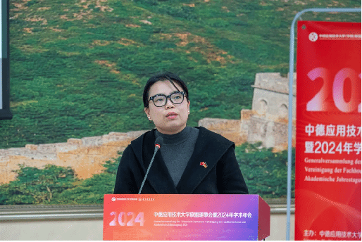 在会议的学术报告环节,侯院长以《中外合作办学项目视域中的 “四维” 人才培养体系创新与实践》为题,详细介绍了学院在中德合作项目中的人才培养路径。“四维” 人才培养体系,分别从励志教育、导师团、互助学习和有效的教与学四个维度入手,致力于全面提升学生的综合素质。励志教育旨在激发学生的学习动力,帮助他们树立明确的学习目标;导师团则为学生提供个性化的学习指导,解决学习方法上的困惑;互助学习通过小组合作等形式,培养学生的团队协作能力和自主学习能力;有效的教与学则聚焦于提升教学质量,使学生真正掌握专业知识和技能。通过这四个维度的协同作用,努力为学生打造一个全方位、多层次的学习成长环境,助力其成为具有国际视野和竞争力的应用型人才。