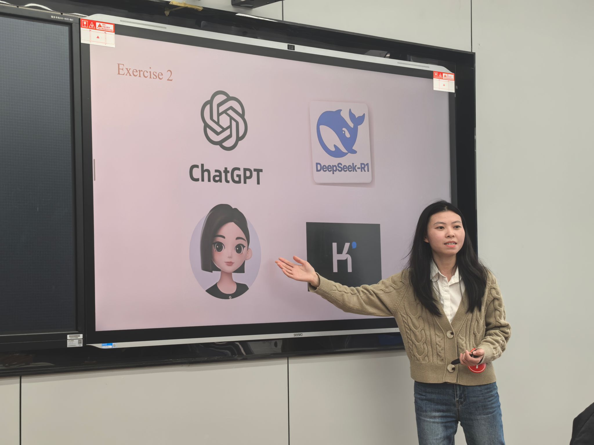 7号姚金术老师以PEEL逻辑链(Point – Explain – Example – Link)为核心,教学生如何回答雅思口语Part3问题,并引入对AI工具进行批判性使用的启示。8号刘夏宁老师讲授电气工程及其自动化专业知识,向学生传递“无需许可即可创造”的理念,强调创新自主和实践精神,激励学生不止步于做AI的使用者,更要运用专业知识做AI的创造者。9号宋真老师以德语语法知识即介词imn, an, auf “静三动四”的用法为教学内容,通过引导学生自主发现规则,增强学生思辨和归纳总结的能力,培养学生的环保意识。