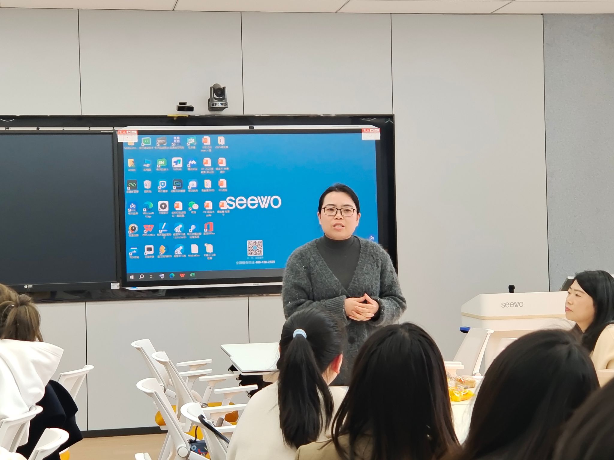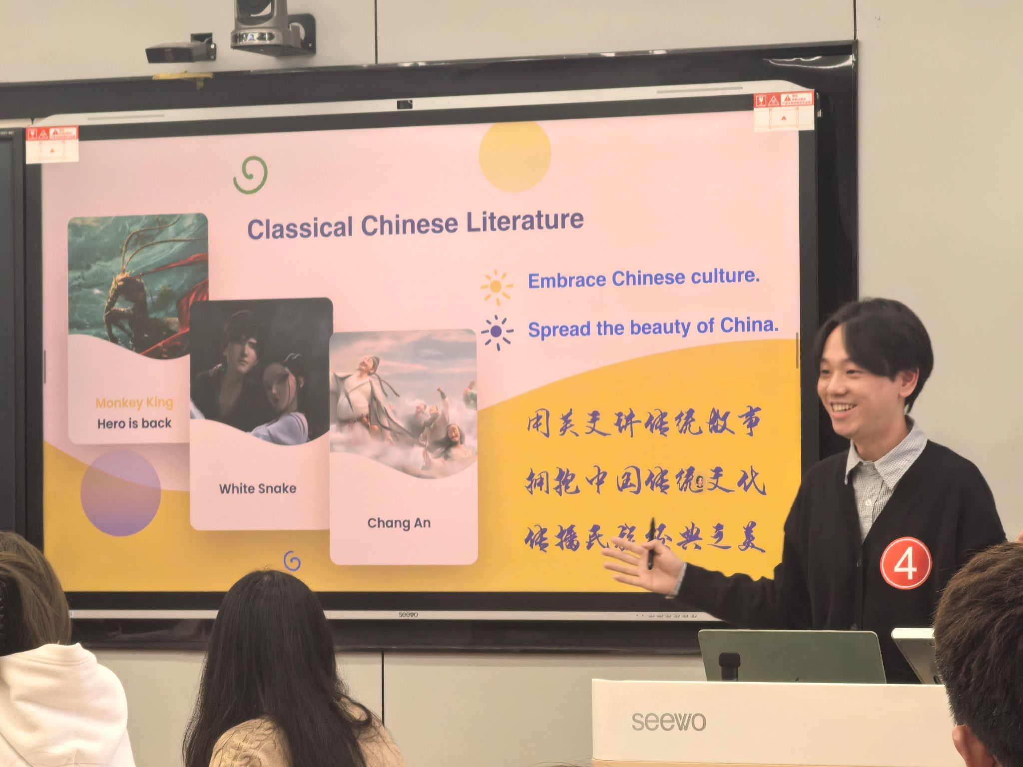 3号汤恬老师利用AI技术,带领学生深入了解中国各省份的地理位置,引导学生树立民族自豪感。4号唐经纬老师以《哪吒2》为素材,运用多种网络教学工具,讲授了如何回答雅思口语话题,激励学生用英文讲传统故事,传播民族经典之美。