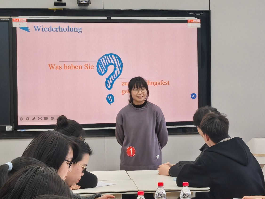 竞赛现场,各位参赛教师纷纷使出浑身解数,展现了扎实的教学功底和独特的教学风采。1号谢丹妮老师将德语语法知识巧妙融入实际语境,结合游戏强调户外活动和健康生活方式的重要性。2号杨云秋老师则通过讲授德语阴性和阳性职业、问答职业信息的句型等,启发学生职业无需用性别设限。