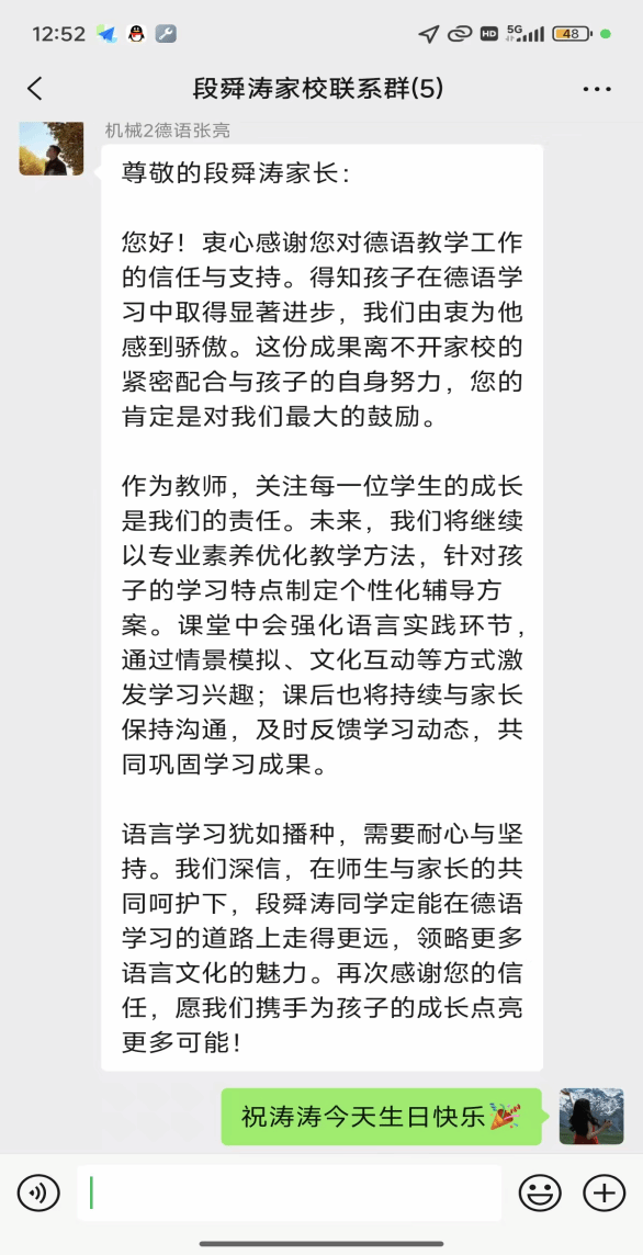语言学习犹如播种,需要耐心与坚持。我们深信,在师生与家长的共同呵护下,段舜涛同学定能在德语学习的道路上走得更远,领略更多语言文化的魅力。再次感谢您的信任,愿我们携手为孩子的成长点亮更多可能!