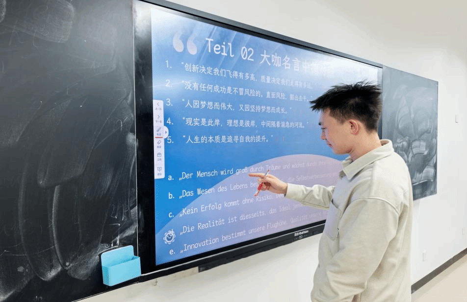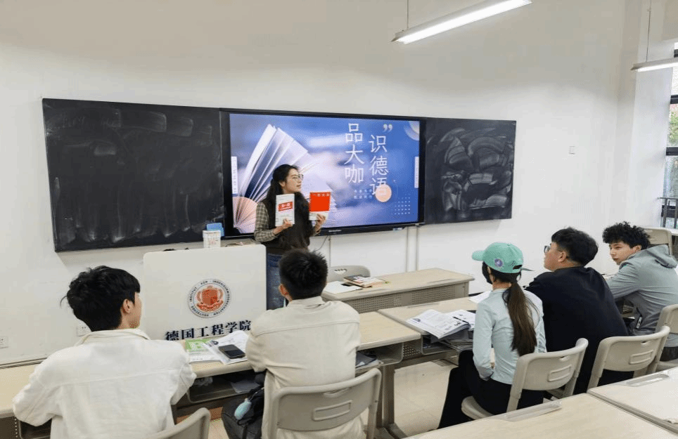 4月,德国工程学院机械设计及其自动化(中外合作办学)专业2022级6班学生在汤恬老师的带领下开展了以“品大咖,识德语”为主题的“大咖阅读+德语学习”融合教学活动,通过“阅读分享、双语互动、名言译制”三大环节,将中国科技企业的创新智慧与德语语言学习深度结合,为中外合作办学背景下的学生搭建起跨文化思维与专业能力提升的双重平台。