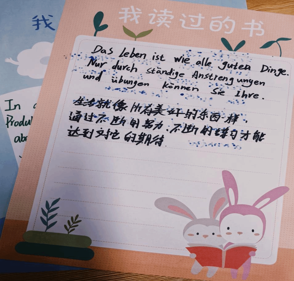 最后,学生们从《任正非传》、《张一鸣商业逻辑》等大咖传记中摘抄喜欢的经典语录,并尝试将其翻译为德语。他们用彩笔在卡片上写下中德双语对照的名言,这些卡片不仅成为学生们的课堂活动纪念品,更是他们人生道路中的座右铭。