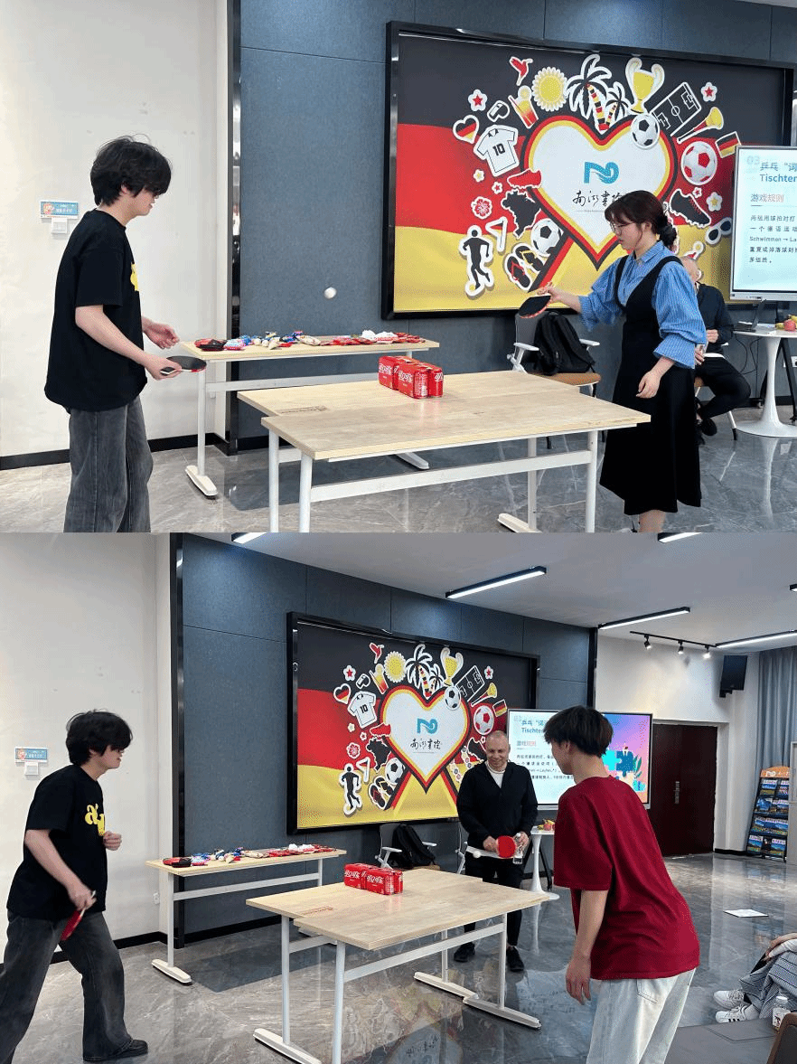 压轴环节中,两支队伍展开德语运动词汇接龙比拼。乒乓球每成功往返一次,击球方必须喊出新词汇(如“Fußball→Basketball→Turnen…”)。随着回合加速,词汇从常见运动延伸到“Klettern攀岩”“Fechten击剑”等专业术语,最终以红队以连续接龙23个词汇创造新纪录。