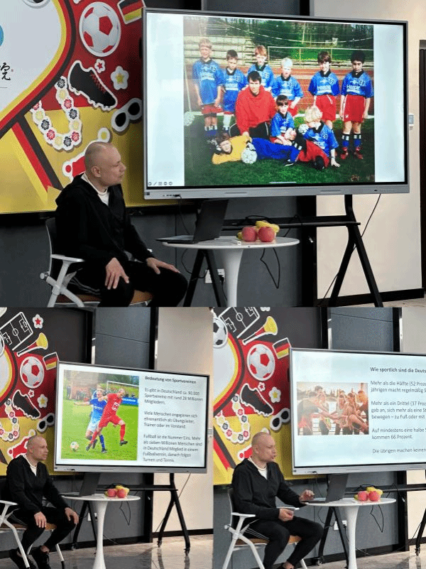 外教Julio则从德国社会结构切入,解析全民健身的“俱乐部文化”:“在德国,90%的青少年至少加入一个体育俱乐部,这不仅是运动场所,更是社交与团队精神培养的摇篮。”他特别以亲身经历讲述德国足球文化如何塑造国民性格,并揭秘了一项鲜为人知的“德国创造”——现代手球运动。“1920年,柏林体育教师发明了11人制手球,这项强调策略与协作的运动后来风靡欧洲,成为德国体育精神的象征。”台下学生边听边记录关键词,不时发出惊叹。