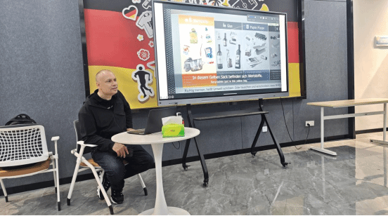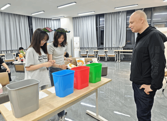 活动伊始,外教Julio详细介绍了德国的垃圾分类规则和常见词汇表达。外教通过图片和实例,向同学们展示了德国如何将垃圾分为Gelbe Tonne、Glastonne、Papiermüll、Biomüll、Restmüll、Sperrmüll......并用德语讲解了相关词汇,如“Karton”(纸箱)、“Glas”(玻璃)、“Plastik”(塑料)等。这种直观的讲解不仅让同学们对德国的垃圾分类有了清晰的认识,还帮助他们积累了实用的德语词汇。
