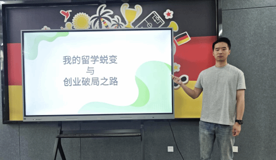 5月9日下午,德国工程学院“企业高管进课堂”系列活动第29期在南湖书院中德创意工坊成功举办。2014级中德本科双学位校友、重庆中立实业集团有限公司总经理兼重庆点知识网络科技有限公司董事长喻言重返母校,以“我的留学蜕变与创业破局之路”为主题,为师生们带来了一场精彩纷呈的创新创业分享会。本次活动由机械双语教学教研室曹雪姣老师主持,周密老师及德工各年级学生参与。