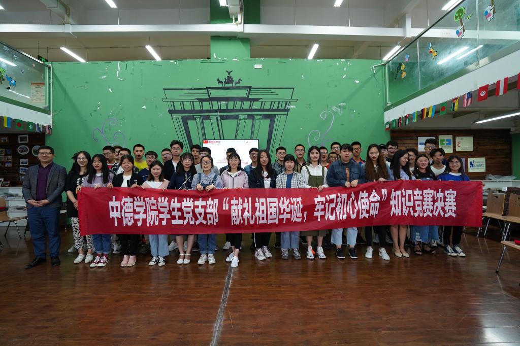 在新中国成立70周年的华诞到来之际,为引领青年进一步了解中国革命、建设和改革历程,坚定实现中华民族伟大复兴中国梦的信心,中德学院学生党支部举办了“献礼祖国华诞,牢记初心使命”主题的党日活动知识竞赛。决赛于5月29日下午4点在中德书屋举行。六组参赛同学经过初赛,复赛脱颖而出进入到最终的决赛环节。党委的逯静老师,中德副院长武强义,辅导员李佳,莫晓雯,黄景龙和肖瑶老师担任决赛评委。