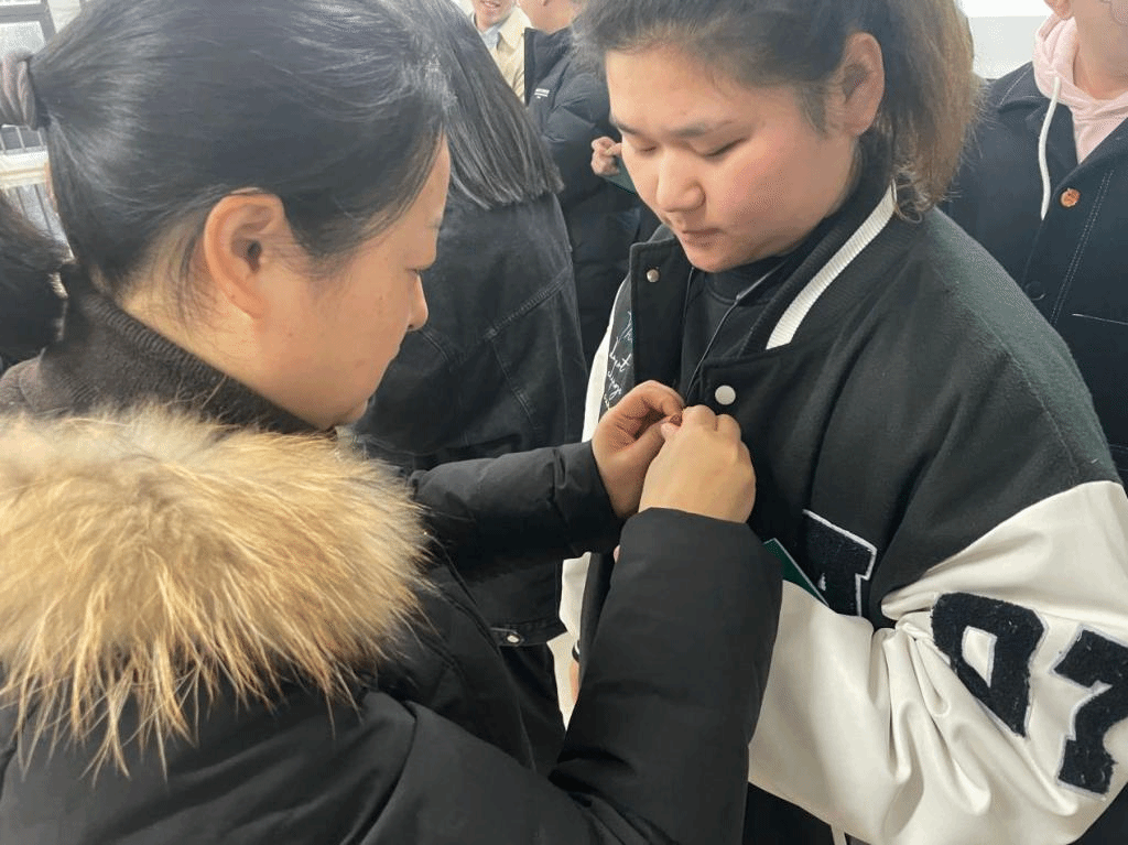 接下来,莫晓雯老师为新团员分发团员证和团徽,并佩戴团徽。此刻,新团员们接下的不仅仅是一-份荣誉,也是一份沉甸甸的使命与担当。
