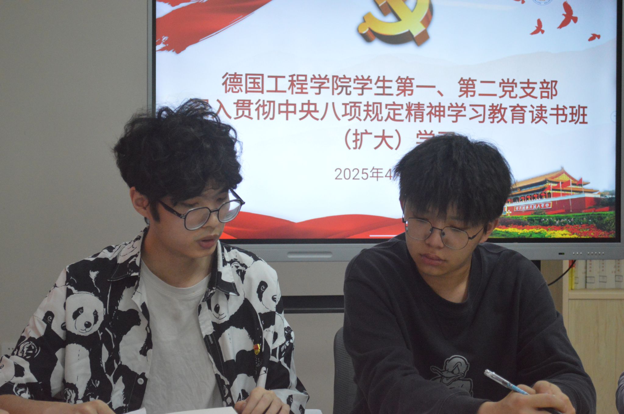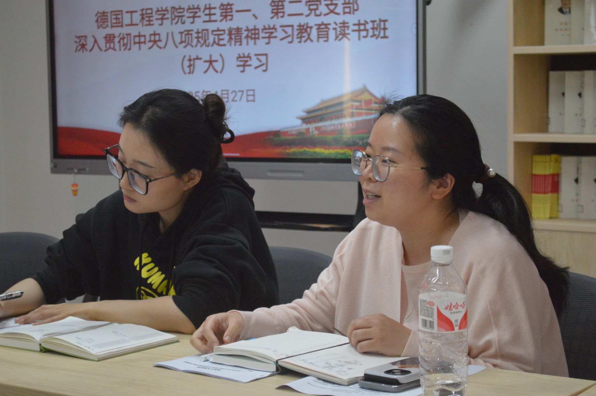 4月27日下午,德国工程学院学生第一、第二党支部在南湖书院党团活动室召开了深入贯彻中央八项规定精神学习教育读书班专题学习会。会议由德国工程学院学生第二党支部书记王媛媛同志主持,德国工程学院党总支副书记李伟光、德国工程学院学生第一、第二党支部支部委员、学生党员、发展对象共同深入学习中央八项规定精神,汲取思想力量,强化党性修养。