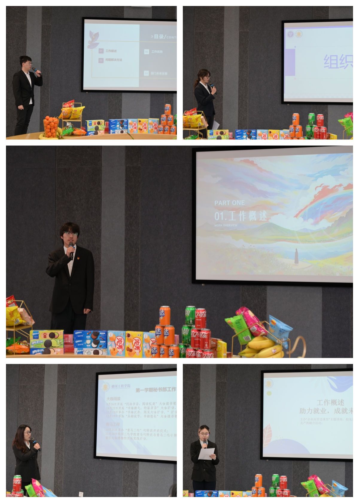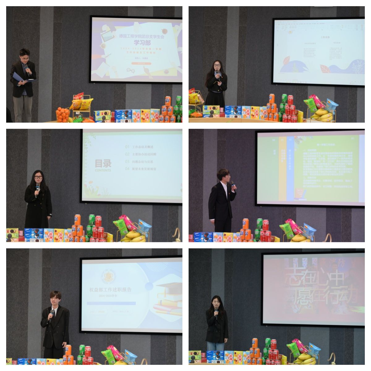 大会在主持人周虹伶同学热情洋溢的开场致辞中拉开帷幕。她详细阐述了本次交流大会的流程与意义,瞬间点燃现场气氛。随后,组织部、秘书部、德工在线等多个部门依次上台述职,从活动开展、对外交流合作,到文化艺术活动策划、后勤保障等多个维度,全面展示过去一学期的工作成果。述职报告形式丰富多样,文字总结搭配图片、图表展示,让在场师生对各部门工作有了更为直观和深入的了解。