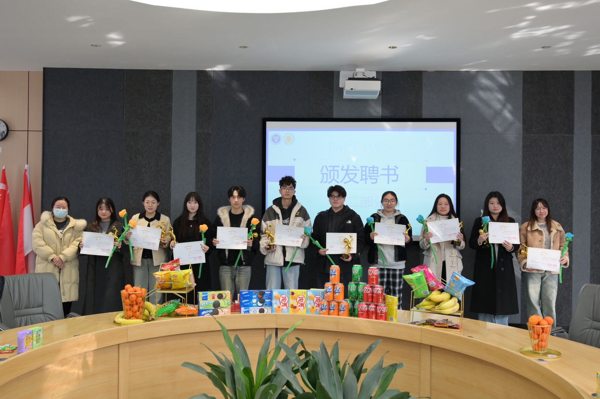 颁奖环节将大会推向高潮。肖瑶老师、刘东鹏老师和秦雪菲老师为上届优秀干部干事颁发聘书,对他们过去一年的杰出贡献予以高度认可。这份荣誉不仅是对个人努力的肯定,更是激励全体成员奋勇向前的动力。
