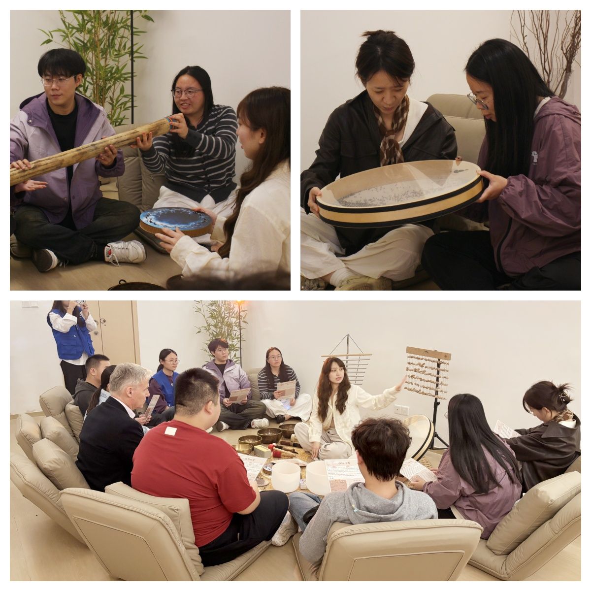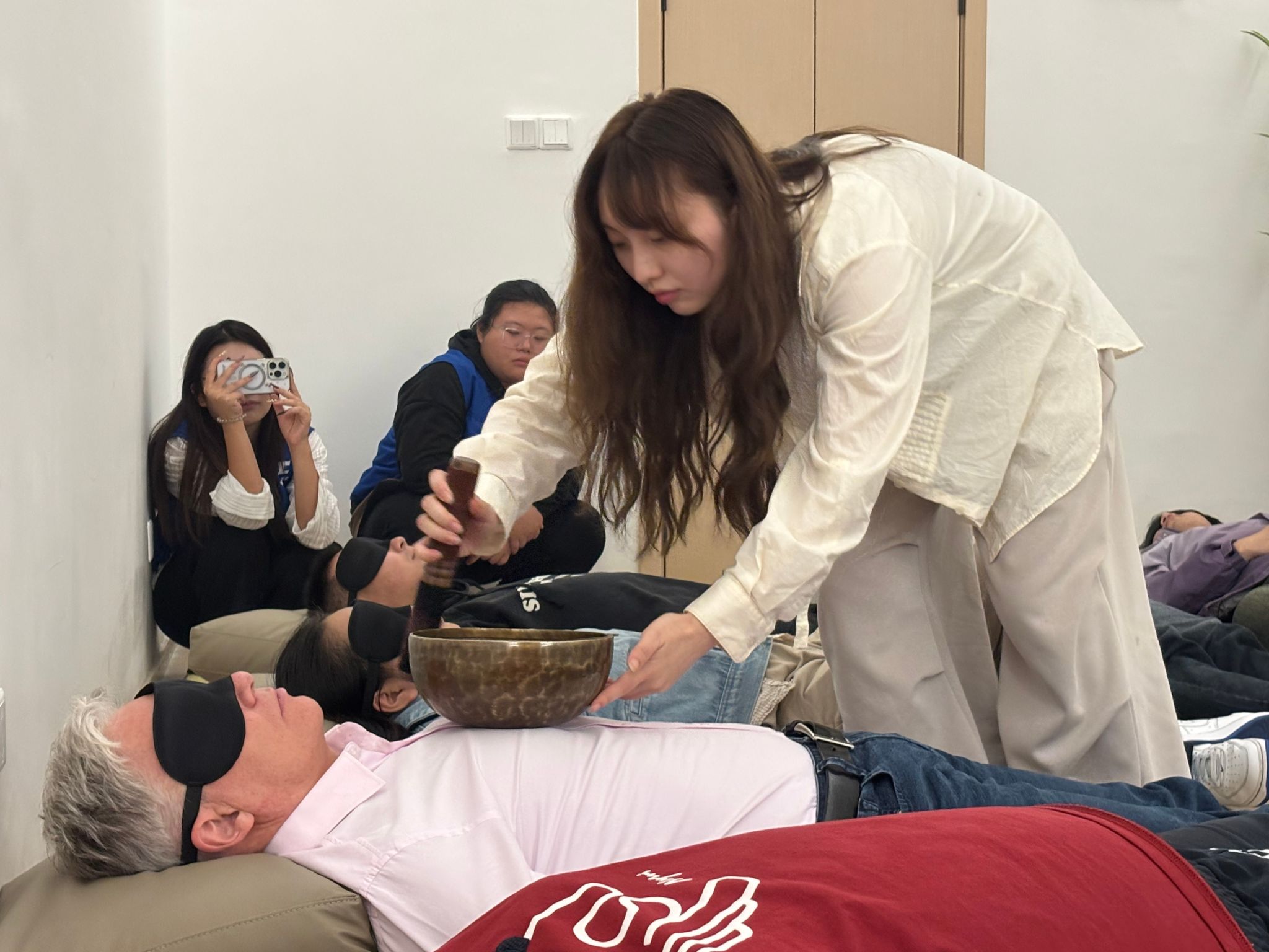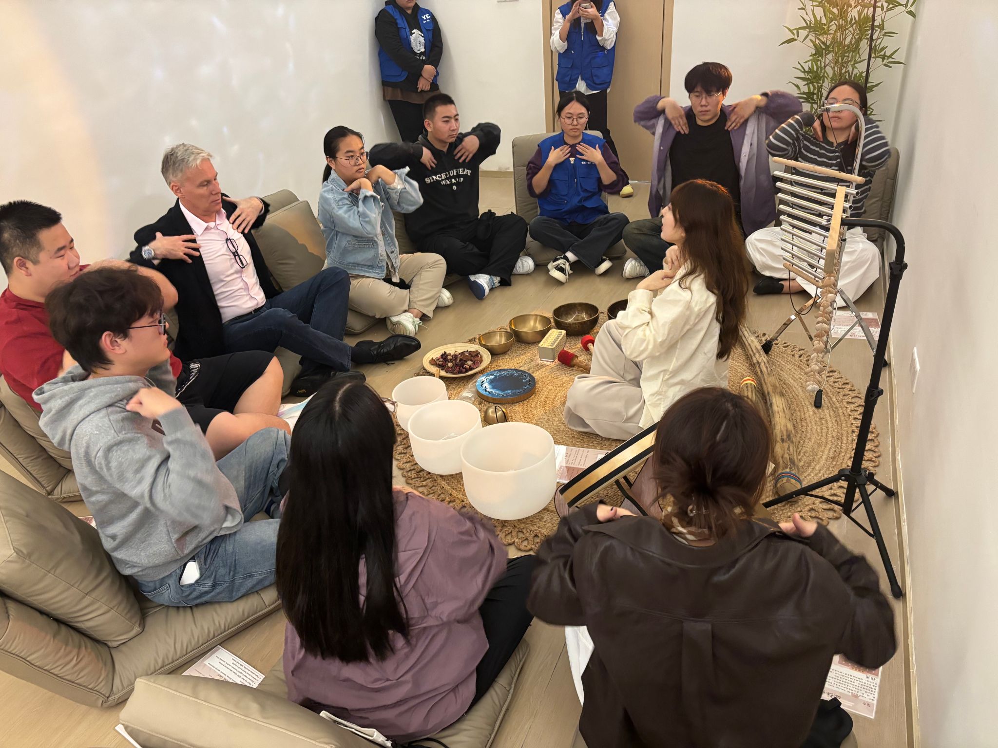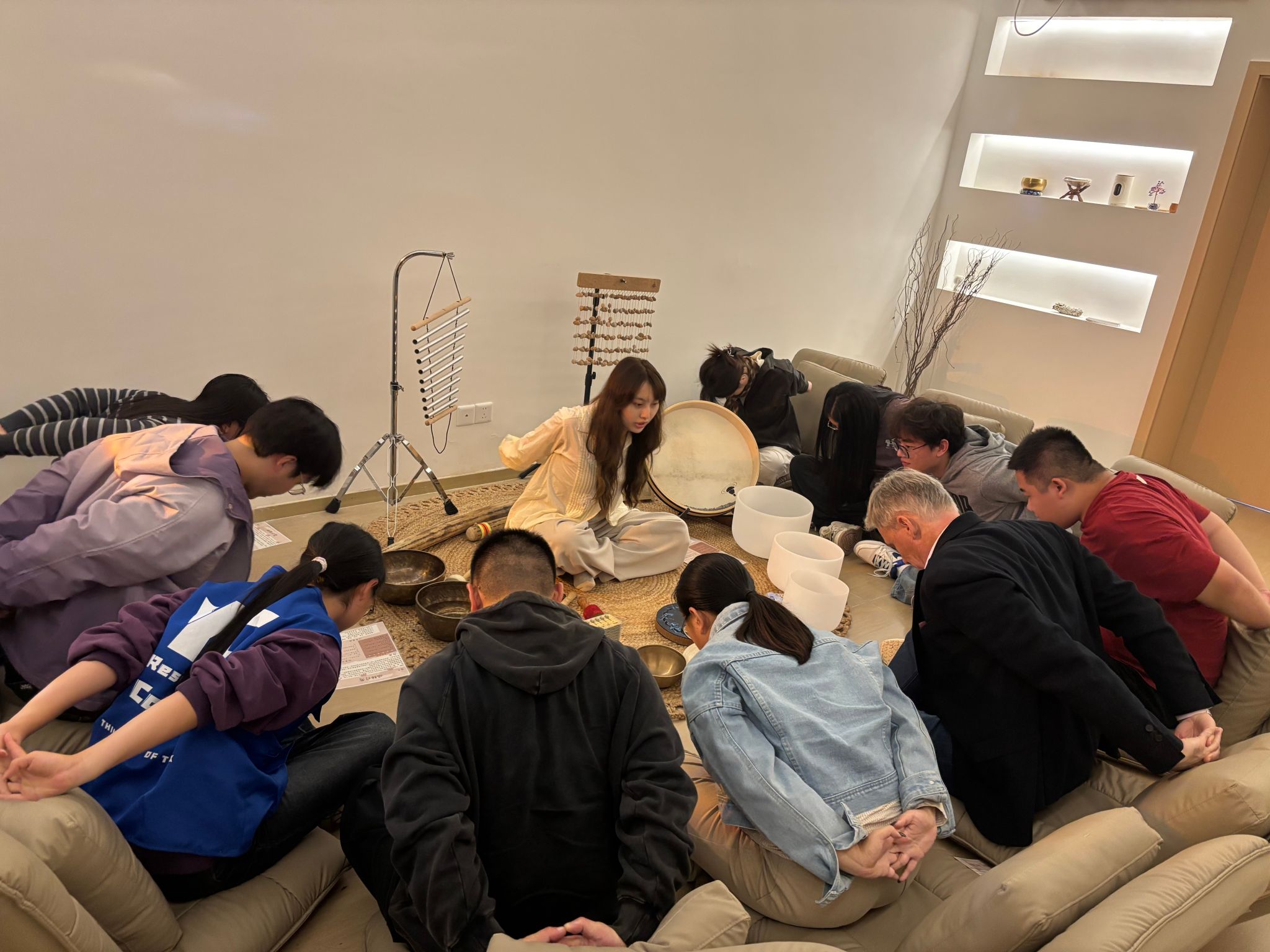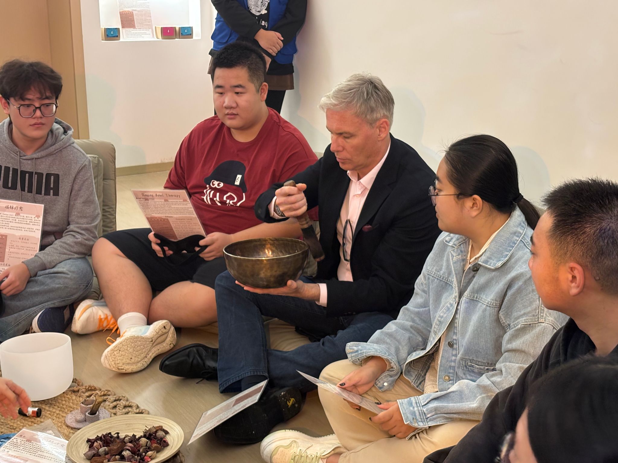 核心疗愈环节升级打造为“双语+文化”双重沉浸空间,强化疗愈氛围。Nils教授和德工师生围坐成圈、闭上双眼。随着不同“月颂”响起,低频声波透过地面传递至身体,高频泛音在耳畔轻柔萦绕,现场逐渐陷入宁静,不少师生慢慢舒展紧绷的肩膀,眉头随之舒展。
