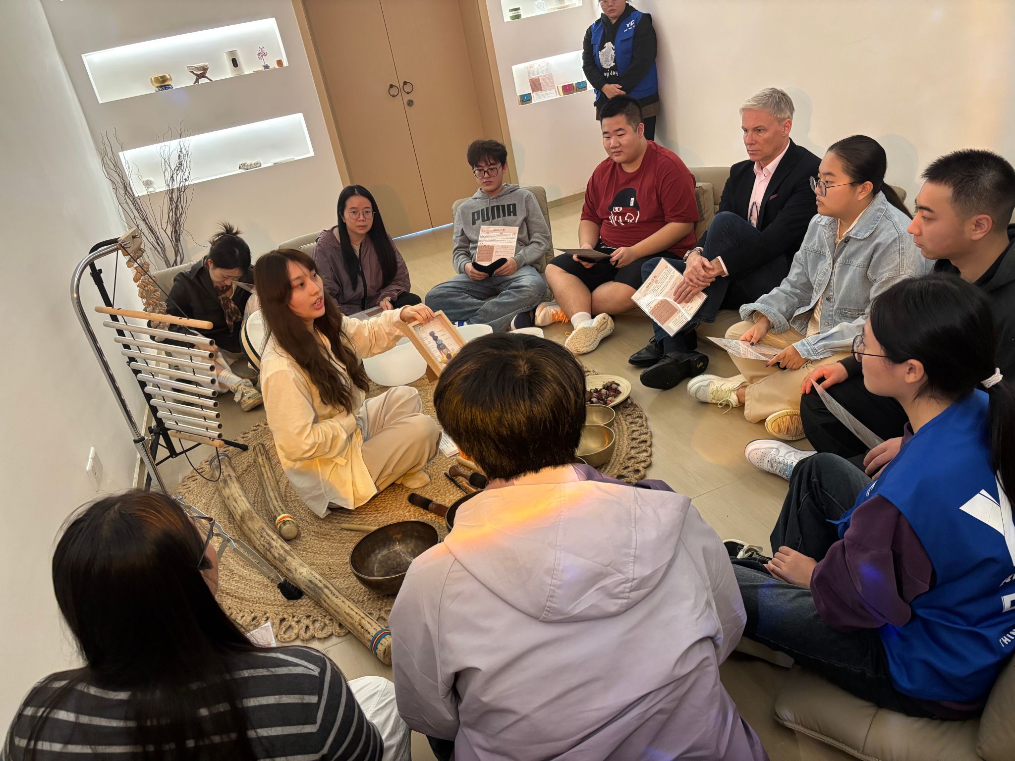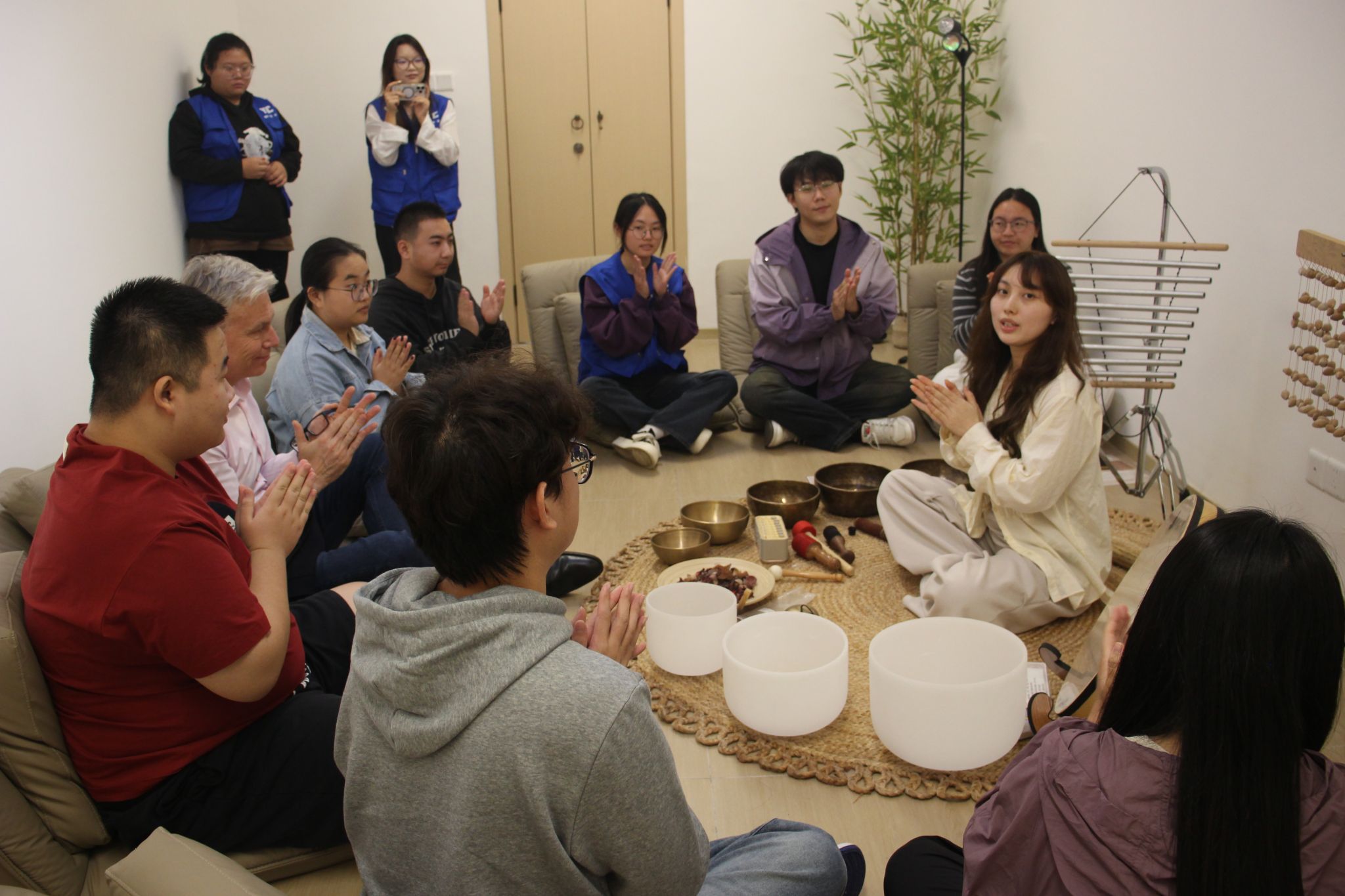 为打破文化与语言壁垒,2025年10月25日下午两点,德国工程学院冲“雅”协会与鱼城书院冥想时间工坊联袂打造“钵语跨疆,声愈国际”双语颂钵疗愈活动。作为首次将“颂钵艺术”与“英语文化”深度融合的创新实践,活动延续了鱼城书院冥想时间工坊“知识科普+乐器认知+沉浸式体验”的核心框架,让中外师生在声波共振中感受无国界的疗愈力量,本次活动邀请了 SRH 中国项目负责人Prof. Dr.-Ing. Nils Roman Albrecht。